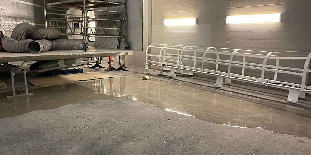 Upon obtaining satisfactory results from the pull-off adhesion test, Flowstone proceeded to prime the entire floor area, followed by the application of a silica sand blind. The silica sand acts as a broadcast material, enhancing the adhesion and texture of the subsequent flooring system.